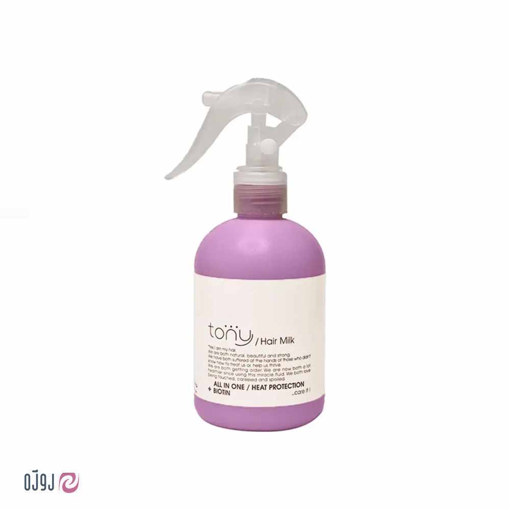 شیر مو تونی آل این وان یک محصول ایرانی از برند تونی است. این محصول محلولی برای محافظت از مو در برابر حرارت سشوار و اتو می باشد که از ریزش موها جلوگیری می کند و مانع از دست رفتن رطوبت مو می شود و در نتیجه از خشکی، شکستگی و موخوره جلوگیری خواهد کرد. شیر مو تونی آل این وان از گره خوردن موها جلوگیری کرده و آن ها را ترمیم می نماید. همانطور که می دانید عوامل مختلفی مانند آلودگی محیطی، اشعه ماوراء بنفش خورشید، موهای وز و اثرات ناشی از کلر موجود در آب استخر و نمک دریا و همچنین آسیب های فیزیکی مانند استفاده طولانی مدت از سشوار و شانه کردن باعث خشکی و آسیب مو می شود. موهای خشک و آسیب دیده حالتی ناهموار و شکننده دارند و فاقد درخشندگی لازم هستند. برای مشاهده تمامی محصولات اسپری نرم کننده مو کلیک کنید.
